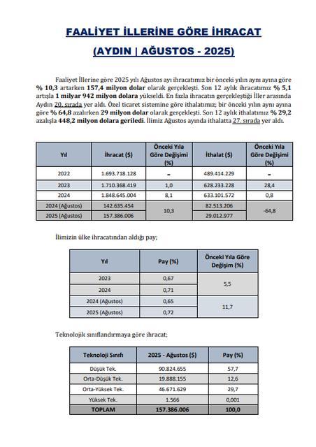 Aydın Sanayi Odası Ağustos ayı ihracat rakamlarını açıkladı. Paylaşılan verilere göre 2025 yılı Ağustos ayında Aydın'da 157,4 milyon dolar ihracat gerçekleştirdi ve Türkiye’de iller arasında 20. sırada yer aldı. En çok ihracat yapılan ülke İtalya olurken, ... haberin devamı için tıklayın