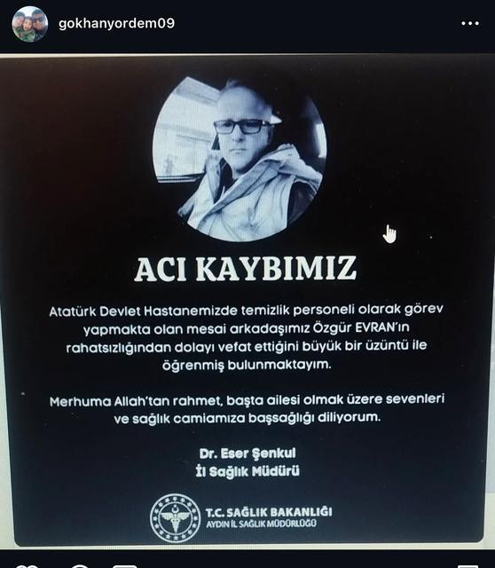 Aydın'da hastane personelinin ölümü sağlık camiasını yasa boğdu. Aydın Atatürk Devlet Hastanesi'nde temizlik personeli olarak görev yapmakta olan Özgür Evran'ın rahatsızlığından dolayı vefat haberi sağlık camiasını yasa boğdu. Aydın İl Sağlık Müdürü ... haberin devamı için tıklayın