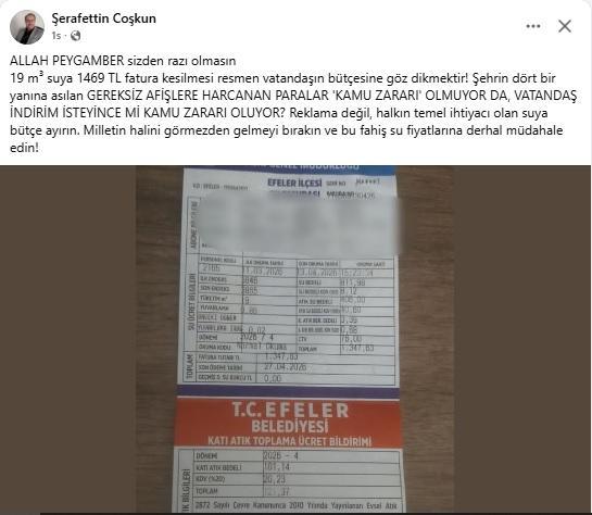 Aydın’ın Efeler ilçesinde yaşayan bir vatandaşın yüksek su faturası tepkisi gündem oldu. Sosyal medyada paylaşılan faturaya yönelik eleştirilerde, “Recep Tayyip Erdoğan ne diyorsa tersini yapıyorlar” sözleri dikkat çekti. BİN 469 TL’LİK FATURA ... haberin devamı için tıklayın