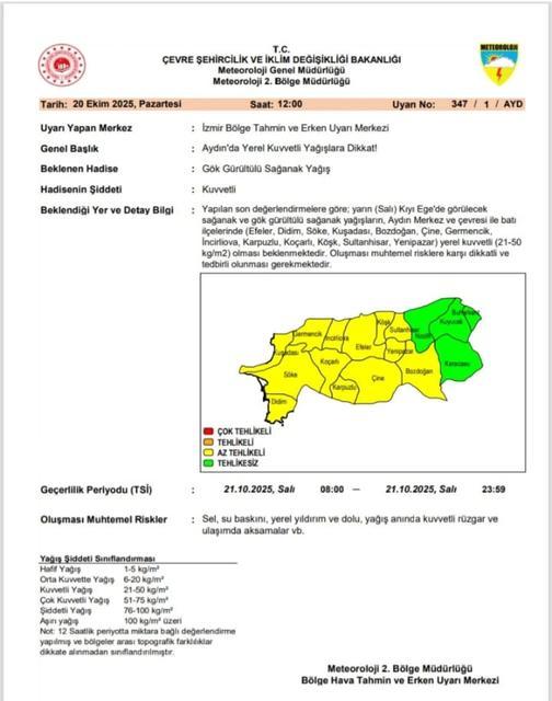 Meteoroloji Genel Müdürlüğü, Aydın genelinde 21 Ekim Salı günü yerel kuvvetli sağanak ve gök gürültülü yağış beklendiğini açıkladı. Aydın İl Tarım ve Orman Müdürlüğü, olası sel, su baskını, yıldırım ve ulaşım aksaklıklarına ... haberin devamı için tıklayın