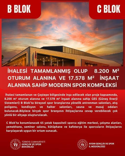 Aydın Valiliği tarafından ihalesi tamamlanan modern spor kompleksi, 8 bin 200 m² oturum alanı ve 17 bin 578 m² inşaat alanıyla Çeştepe bölgesinde hayata geçirilecek. Tesis, çok amaçlı spor salonlarından sporcu eğitim merkezine kadar farklı branşların ihtiyaçlarını ... haberin devamı için tıklayın