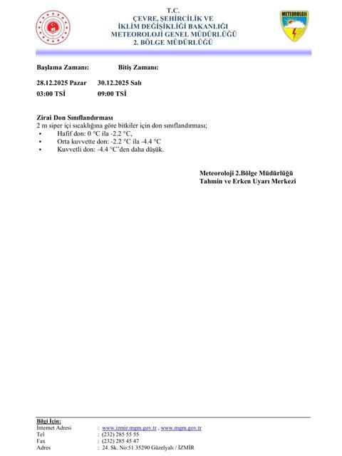 Aydın İl Tarım ve Orman Müdürlüğü, 28-30 Aralık 2025 tarihleri arasında zirai don riski uyarısı yaptı. Aydın İl Tarım ve Orman Müdürlüğü Aydın il genelinde 28 Aralık Pazar sabahından başlayarak 30 Aralık Salı sabahına kadar soğuk hava dalgasının etkili olacağını ... haberin devamı için tıklayın