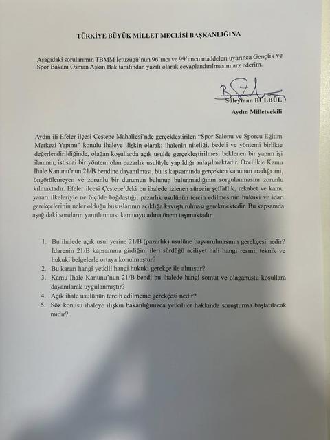 CHP Aydın Milletvekili Süleyman Bülbül, Efeler’de yapılması planlanan spor salonu ve sporcu eğitim merkezi ihalesinin “pazarlık usulü” ile belirli bir isme verildiğini ileri sürdü. Bülbül, sürecin şeffaflığına dikkat çekerek Gençlik ... haberin devamı için tıklayın