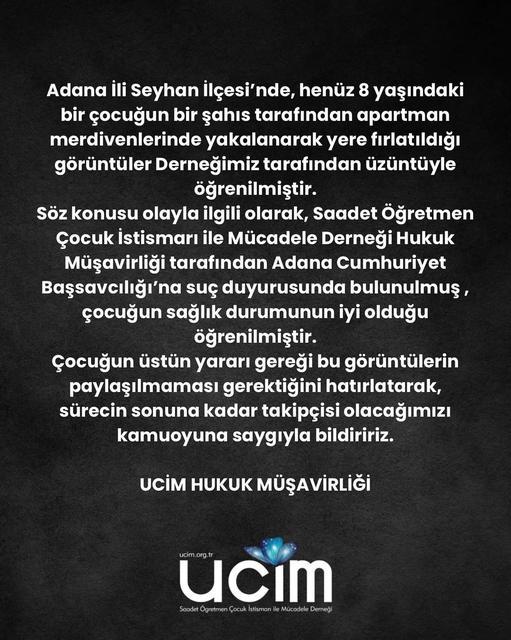 Adana Seyhan’da 8 yaşındaki bir çocuk, apartman merdivenlerinde bir şahıs tarafından yere fırlatıldı. UCİM Aydın İl Temsilciliği, olayla ilgili suç duyurusunda bulunulduğunu ve çocuğun sağlık durumunun iyi olduğunu açıkladı. Dernek, sürecin sonuna kadar takipçisi ... haberin devamı için tıklayın