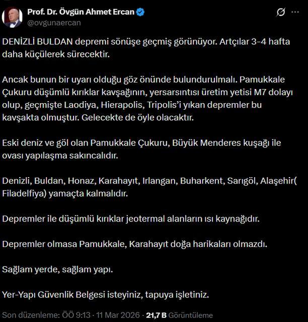 Denizli’nin Buldan ilçesinde yaşanan 4 büyüklüğündeki deprem, Aydın ve çevresinde hissedildi. Depremin ardından Jeofizik Yüksek Mühendisi Prof. Dr. Övgün Ahmet Ercan, Büyük Menderes Ovası ve Buharkent için dikkat çeken ... haberin devamı için tıklayın