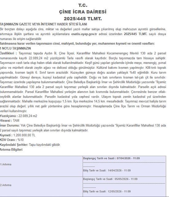 Aydın’ın Çine ilçesinde yer alan 22 bin metrekarelik tarla, icra yoluyla satışa çıkarıldı. Otlak olarak kullanılan ve kadastral yola cephesi bulunan taşınmaz için artırma tarihleri açıklandı. Çine İcra Dairesi tarafından yürütülen 2025/445 ... haberin devamı için tıklayın