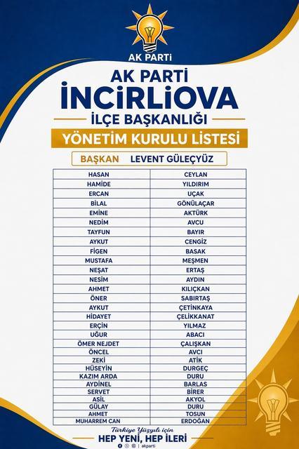 Aydın’ın İncirliova ilçesinde AK Parti teşkilatında yeni yapılanma tamamlandı. İlçe Başkanı Levent Güleçyüz’ün oluşturduğu 30 kişilik yönetim kurulu genel merkez tarafından onaylanarak resmileşti. Adalet ve Kalkınma Partisi (AK Parti) Genel Merkezi, ... haberin devamı için tıklayın