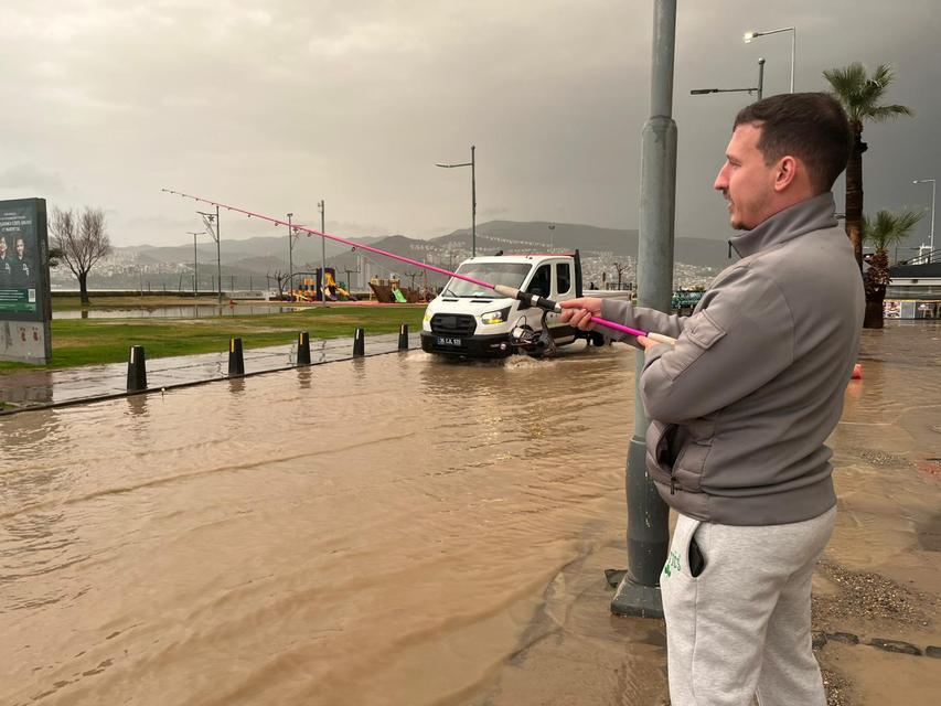 İzmir’de öğle saatlerinde etkili olan sağanak yağış hayatı olumsuz etkiledi. Konak ilçesi Alsancak Kordon Boyu'nda altyapıdan kaynaklı su baskınları yaşanırken, caddelerin göle döndüğü bölgede bir vatandaş duruma oltasını suya atarak tepki gösterdi. Kent ... haberin devamı için tıklayın