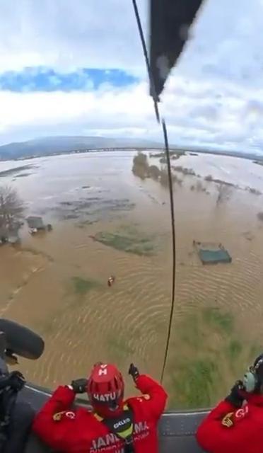 Aydın'ın Koçarlı ilçesinde Menderes Nehri'nin taşması sonucu birçok arazi sular altında kalırken, suların ortasında mahsur kalan vatandaşın helikopter ile kurtarılma anı jandarma kamerasına anbean yansıdı. Aydın genelinde etkili olan sağanak yağış sebebiyle Büyük ... haberin devamı için tıklayın