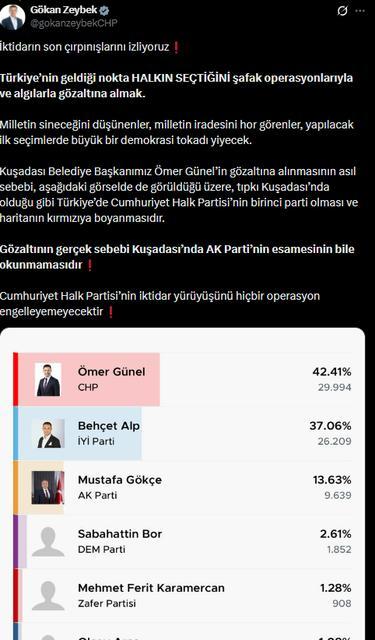 Kuşadası Belediye Başkanı Ömer Günel’in gözaltına alınması siyasette tartışma yarattı. CHP Genel Başkan Yardımcısı Gökan Zeybek, operasyonun siyasi olduğunu savunarak “Kuşadası’nda AK Parti’nin esamesinin okunmaması bu sürecin asıl nedenidir” ifadelerini ... haberin devamı için tıklayın