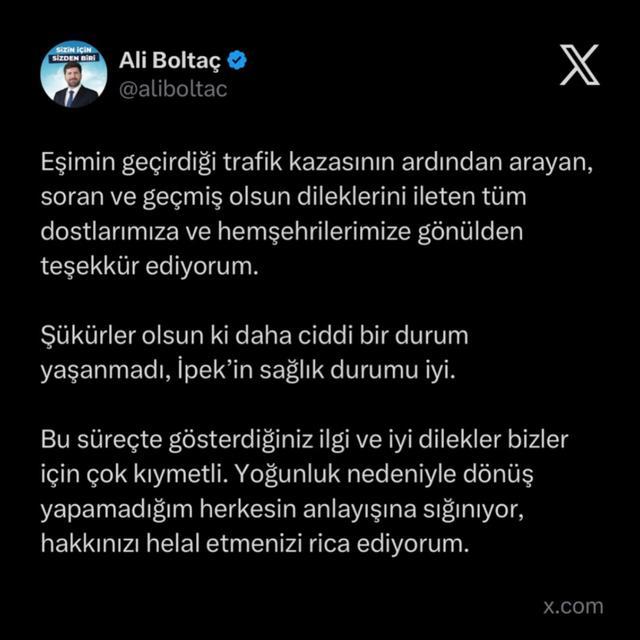 Tarsus Belediye Başkanı Ali Boltaç'ın eşi İpek Boltaç, trafik kazası geçirdi. Mersin Analiz'in haberine göre; eşinin sağlık durumunun iyi olduğunu açıklayan Başkan Boltaç, "Eşimin geçirdiği trafik kazasının ardından arayan, soran ve geçmiş ... haberin devamı için tıklayın