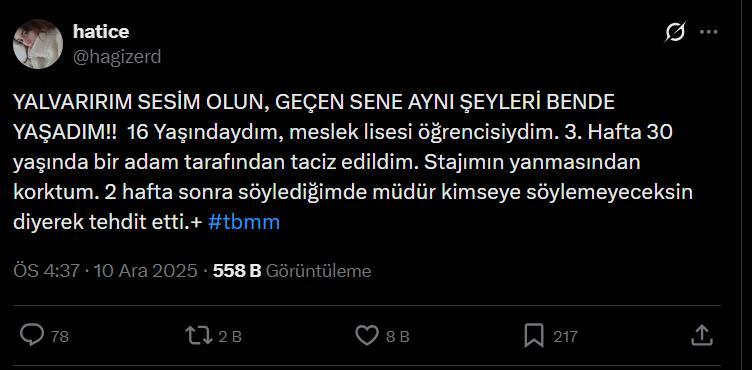 TBMM lokantasında staj yapan kız çocuklarının Meclis personeli tarafından taciz edildiği iddiaları gündemden düşmezken, bir genç kız daha sosyal medya hesabından kendi yaşadıklarını anlatarak yardım çağrısında bulundu. Genç stajyer, 16 yaşındayken uğradığını iddia ... haberin devamı için tıklayın