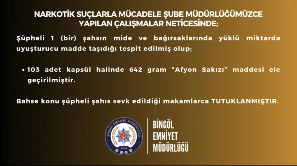 Bingöl’de polis ekiplerince gerçekleştirilen çalışmada, mide ve bağırsaklarında uyuşturucu madde taşıdığı belirlenen şüpheli yakalandı. Bingöl İl Emniyet Müdürlüğü Narkotik Suçlarla Mücadele Şube Müdürlüğü ekiplerince ... haberin devamı için tıklayın