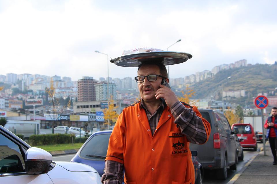 Trabzon'da bir lokantada garson olarak çalışan 53 yaşındaki İsmail Yıldırım sipariş verilen yemeklerin konulduğu tepsiyi eliyle değil de kafasında taşıyarak götürüyor.
