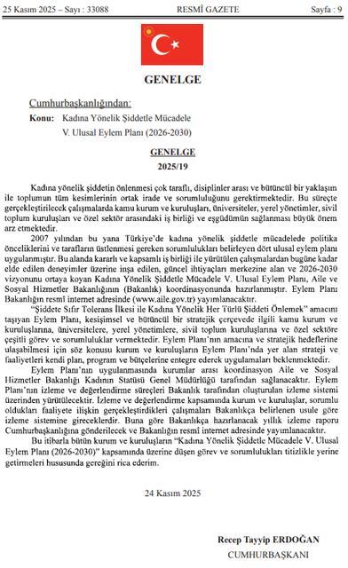 Resmi Gazete’de yayımlanan Cumhurbaşkanlığı kararı ile Türkiye, kadına yönelik şiddetle mücadelede yeni bir adım attı. Resmi Gazete’de yayımlanan genelge ile birlikte Türkiye, kadına yönelik şiddet alanında beşinci ulusal eylem planını yürürlüğe koydyu. ... haberin devamı için tıklayın